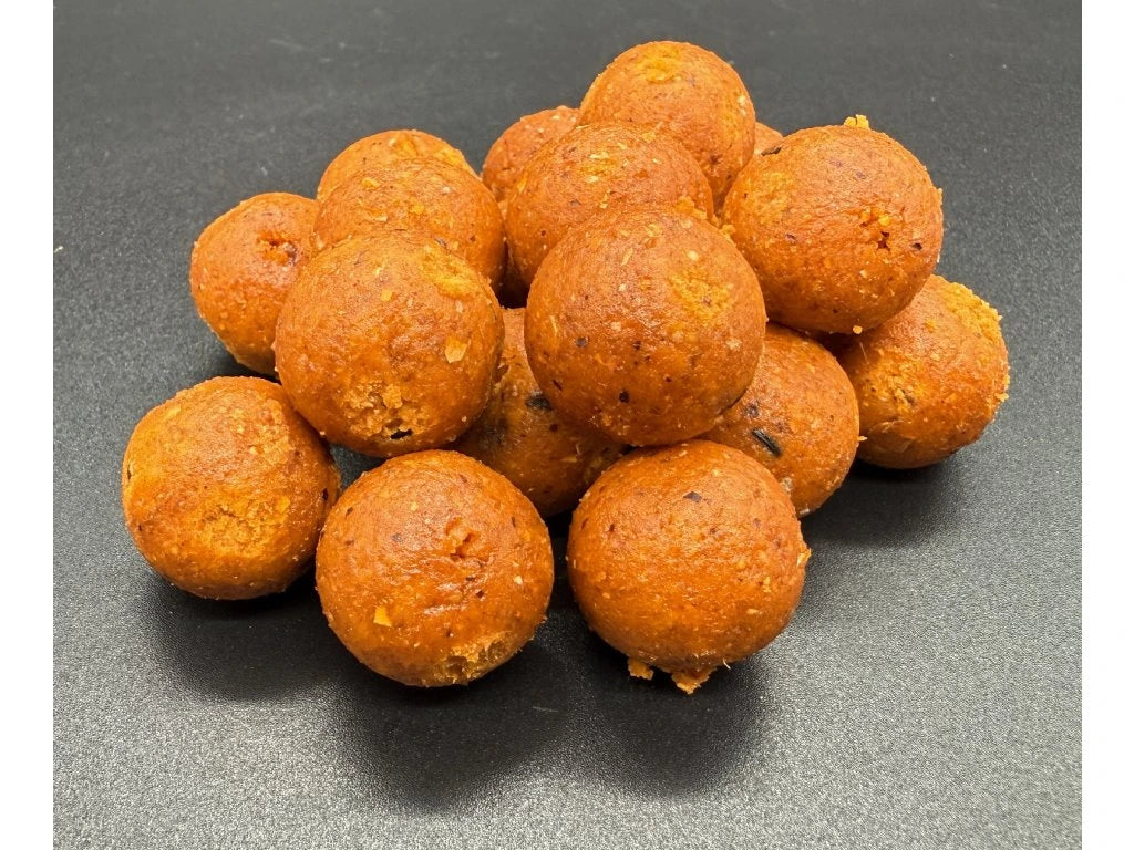 Eigenschaften des Boilies: Diese Boilies bestehen zu 50 % aus einer Mischung aus Rohmaterial und Niger und zu 50 % aus einer Trockenproteinmischung und frischen Eiern. Bis zu 80 % der Nährstoffe, davon 35 % Protein, können von Karpfen aufgenommen und verdaut werden und unterstützen so deren Wachstum und Ernährung.